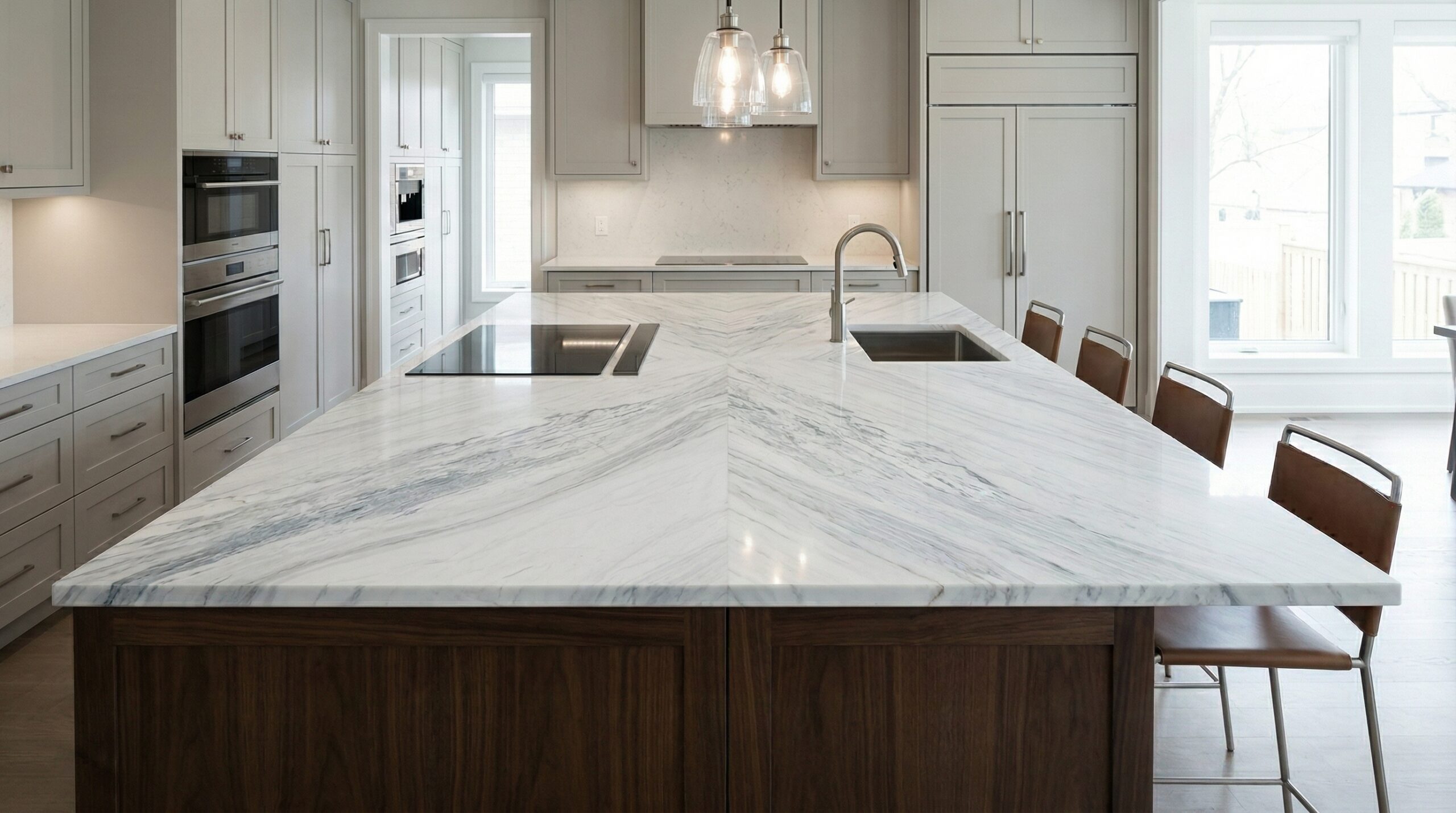 Fusion White Marble – A refined marble with a soft white base and flowing blends of grey and beige tones. Perfect for countertops, walls, and flooring, it adds timeless elegance and natural character to any space.