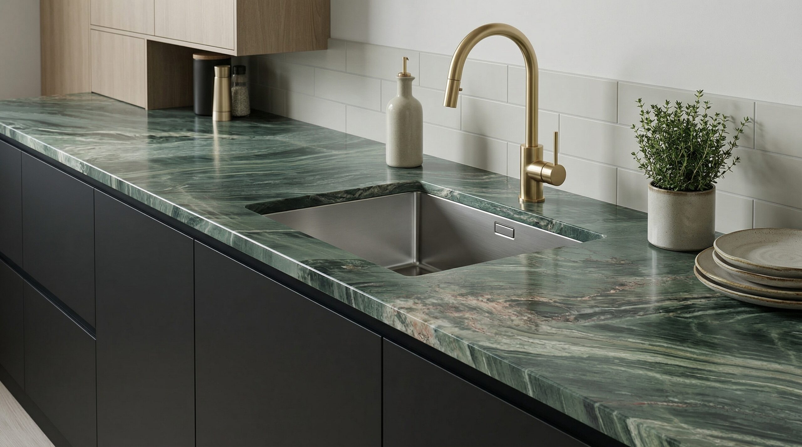 Jade Quartzite features rich green tones layered with natural veining and subtle variations, creating a bold yet elegant statement. Its unique colour adds depth and a luxurious feel to any space. Extremely dense and durable, it offers excellent resistance to heat, scratches, and stains, making it a premium, low-maintenance choice for kitchen benchtops, feature walls, and high-end interiors.